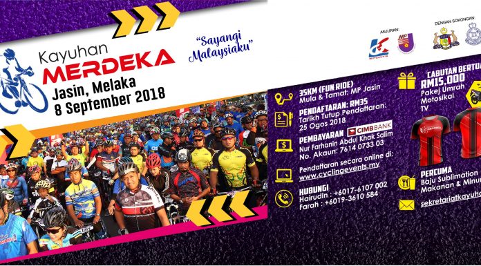 8th September 2018(Saturday)Time7:00 AM - 1:00 PMEvent VenueJasin, Melaka.Event Starting Point AddressMajlis Perbandaran JasinBicycle TypeAll Bicycle with BrakeEvent TypeFun RideRegistration Closing Date25 August 2018Organizer emailfiza145196@gmail.comOrganizer ContactAFIZA BINTI ZAWAWI - 019-7533529